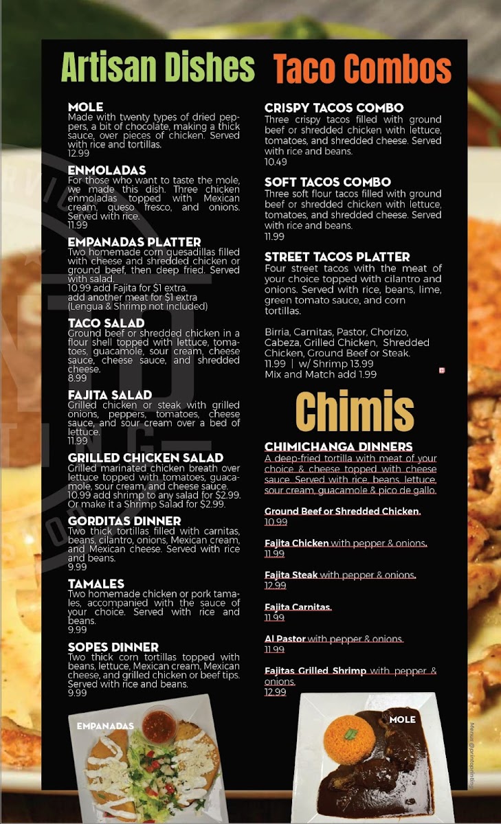 Welcome to Pueblo Viejo Autentica Cocina Mexicana, where every dish tells a story and every bite transports you straight to the heart of Mexico! Nestled at 211 N Cleveland Ave, Cushing, OK, our menu is a vibrant tapestry of authentic flavors, featuring mouthwatering specialties like our famous Mangonada and the classic Chips and Salsa to kick off your culinary adventure. Be sure to indulge in our Bandera Enchiladas or savor the grilled perfection of our Single Fajita Combo, paired beautifully with one of our refreshing Mango Margaritas. Whether you’re in the mood for a hearty Shrimp Cocktail or our beloved Chimichanga Dinner, every option promises to delight. Don't miss our Fresh Homemade Corn Tortillas and tantalizing tacos, including Barbacoa and Pablo's Tacos, practically bursting with flavor. Your journey through our Pueblo Viejo menu awaits—come join us and taste why we’re a local favorite!